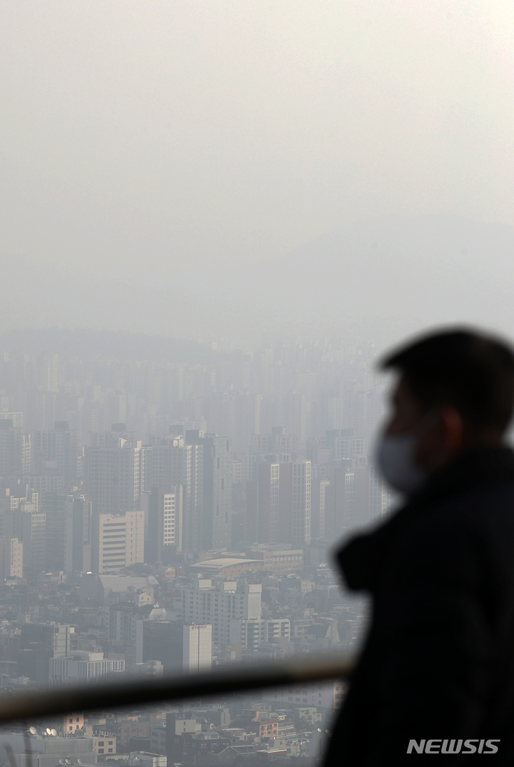 [서울=뉴시스] 조성우 기자 = 서울 등 수도권 미세먼지 농도가 '나쁨' 수준을 보인 12일 오전 서울 남산에서 바라본 서울 도심이 뿌옇다. 2021.12.12. [email protected]