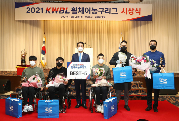 [서울=뉴시스] 권창회 기자 = 22일 오후 서울 리베라호텔에서 열린 2021 KWBL 휠체어농구리그 시상식에서 서울 곽준성(왼쪽부터), 고양 최요한, 배용주 이사장, 서울 이윤주 춘천 조승현, 김상열이 BEST5 상을 받은뒤 기념촬영을 하고 있다.(사진=한국휠체어농구연맹 제공) 2021.12.22. [email protected] *재판매 및 DB 금지