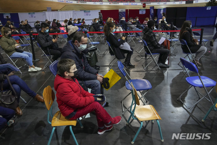 [파리=AP/뉴시스] 22일(현지시간) 프랑스 파리 외곽 코로나19 백신 접종소로 사용되는 생 캉탱 앙 이블린 국립 경륜장에서 한 소년(8)이 아빠와 함께 백신 접종 순서를 기다리고 있다. 프랑스 정부가 5~11세 어린이를 대상으로 대대적인 백신 접종을 시작하면서 어린이들은 초조한 모습으로 접종소를 찾았으나 나갈 때는 '백신 증명서'를 들고 당당하게 걸어 나간다고 현지 관계자가 밝혔다. 2021.12.23.