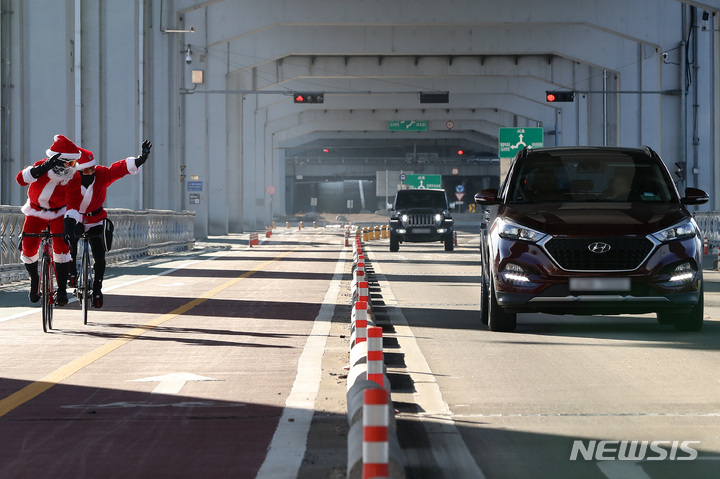 [서울=뉴시스] 백동현 기자 = 크리스마스인 25일 오전 서울 반포한강공원 인근에서 산타클로스 복장을 한 자전거 동호인 김이두 씨와 김영훈 씨가 시민들에게 손을 흔들고 있다. 2021.12.25. [email protected]