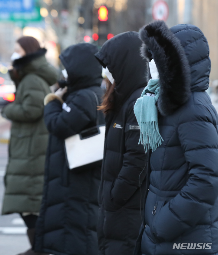[서울=뉴시스] 조수정 기자 = 전국 대부분 지역에 한파특보가 발효된 27일 오전 서울 세종로 사거리에서 시민들이 두꺼운 외투를 입고 출근길 발걸음을 재촉하고 있다. 2021.12.27. [email protected]