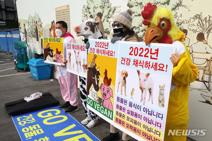 [서울=뉴시스] 배훈식 기자 = 한국채식연합과 비건세상을위한시민모임 회원들이 30일 오후 서울 종로구 세종대로사거리에서 동물 의상을 입고 채식 촉구 피켓팅을 하고 있다. 2021.12.30. [email protected]