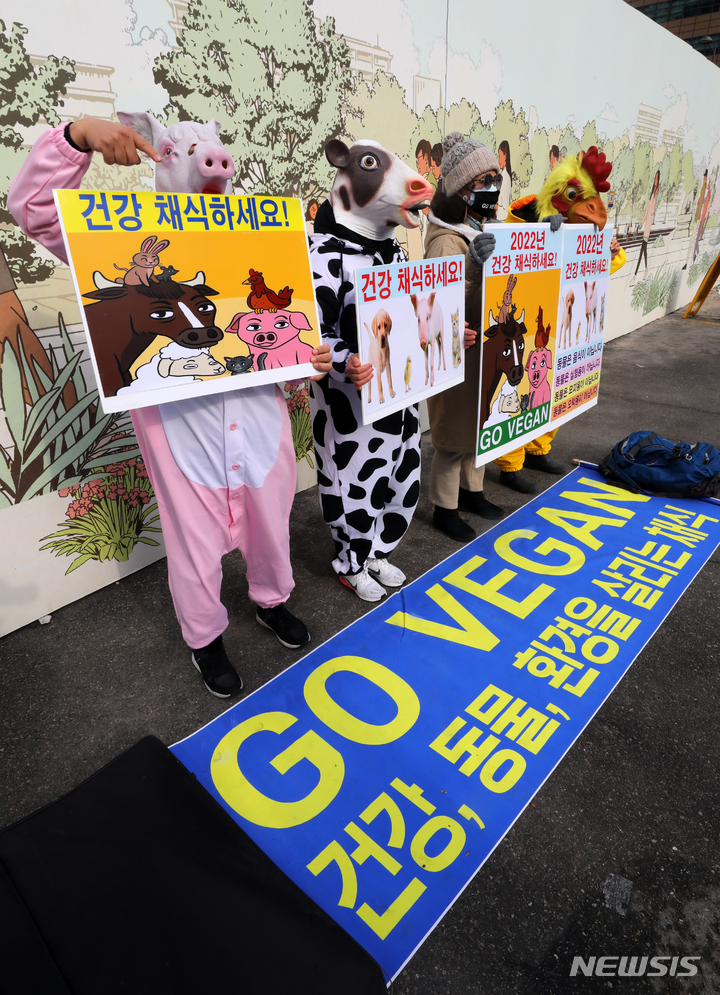 [서울=뉴시스] 배훈식 기자 = 한국채식연합과 비건세상을위한시민모임 회원들이 30일 오후 서울 종로구 세종대로사거리에서 동물 의상을 입고 채식 촉구 피켓팅을 하고 있다. 2021.12.30. [email protected]