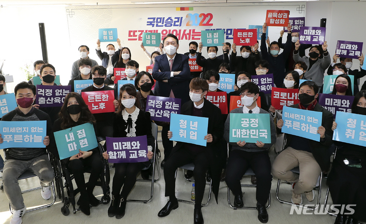 [서울=뉴시스] 최진석 기자 = 윤석열 국민의힘 대선 후보가 1일 서울 여의도 대하빌딩에서 열린 국민의힘 선대위 신년인사회에 참석해 청년보좌역들과 기념촬영을 하고 있다. 2022.01.01. [email protected]