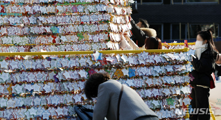 [서울=뉴시스] 홍효식 기자 = 2022년 새해 첫 일요일인 2일 서울 종로구 조계사를 찾은 시민들이 새해 소원을 작성한 뒤 소원탑에 걸고 있다. 2022.01.02. [email protected]