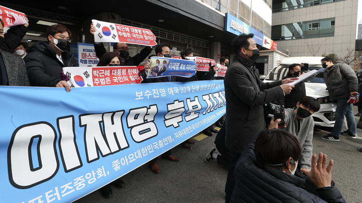 [서울=뉴시스] 최진석 기자 = 김동렬 박근혜서포즈중앙회장이 4일 서울 여의도 더불어민주당 중앙당사 앞에서 박근혜 서포터즈 중앙회 등 보수진영 애국 단체 일부 회원들의 이재명 더불어민주당 대선 후보 지지선언을 하고 있다. 2022.02.04. [email protected]