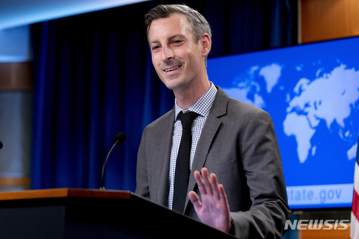 [워싱턴=AP/뉴시스] 네드 프라이스 미 국무부 대변인이 7일(현지시간) 워싱턴 국무부에서 브리핑하고 있다. 프라이스 대변인은 오는 12일 하와이에서 열리는 한미일 외교장관 회담에 대해 한반도 비핵화를 위해 3국 간 협력이 필수적이라고 강조했다. 2022.02.08.