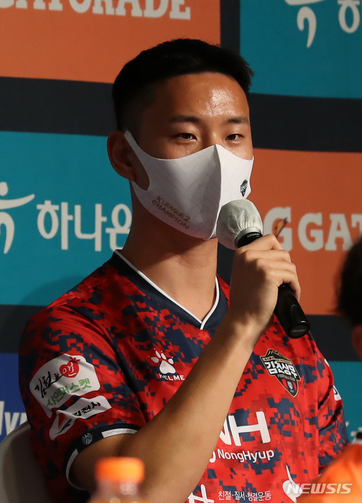 [서울=뉴시스] 이영환 기자 = 김천 상무 정승현이 14일 오후 서울 용산구 백범김구기념관 컨벤션홀에서 열린 K리그1 개막 미디어데이 행사에 참석해 각오를 전하고 있다. 2022.02.14. [email protected]