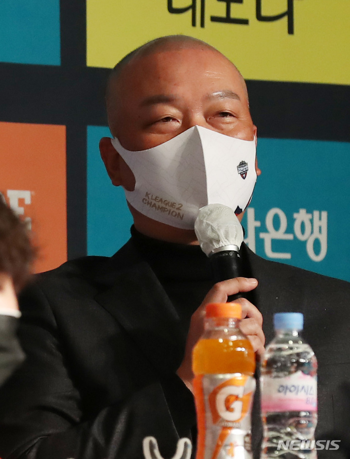 [서울=뉴시스] 이영환 기자 = 김천 상무 김태완 감독이 14일 오후 서울 용산구 백범김구기념관 컨벤션홀에서 열린 K리그1 개막 미디어데이 행사에 참석해 각오를 전하고 있다. 2022.02.14. [email protected]