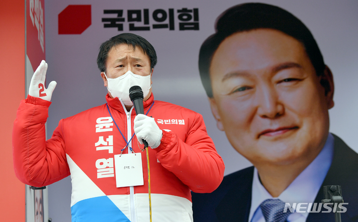 [광주=뉴시스] 류형근 기자 = 제20대 대통령선거 공식 선거운동이 시작된 15일 오전 광주 북구 광주역 광장에서 국민의힘 광주출정식이 열린 가운데 송기석 광주선대위 총괄 공동위원장이 지지를 호소하고 있다. 2022.02.15. [email protected]
