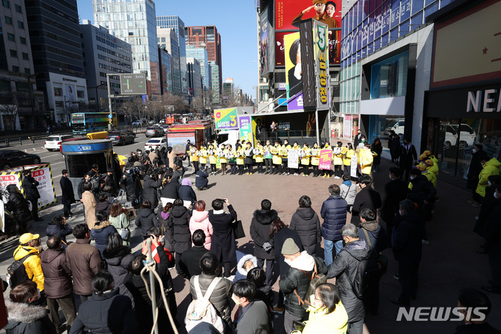 [서울=뉴시스] 국회사진기자단 = 심상정 정의당 대선 후보가 20일 서울 강남구 강남역 인근에서 유세를 하며 지지를 호소하고 있다. 2022.02.20. [email protected]