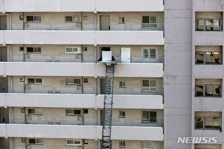 [서울=뉴시스] 백동현 기자 = 21일 오전 서울 송파구 잠실 주공 5단지 아파트에서 작업자들이 인테리어 자재를 옮기고 있다. 지난 16일 서울시에 따르면 도시계획위원회 수권소위원회가 잠실 주공 5단지의 정비계획안을 심의, 통과시켰다고 밝혔다. 2022.02.21. [email protected]