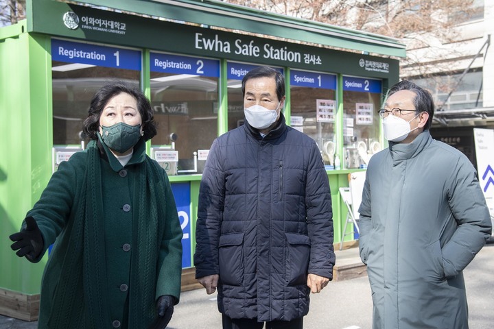 [서울=뉴시스] 김은미(왼쪽부터) 이화여대 총장과 문석진 서대문구청장, 이준영 서대문구보건소장이 23일 서울 서대문구 이화여자대학교 내 이화 세이프 스테이션을 살펴보고 있다. 이화 세이프 스테이션은 이화여대가 씨젠의료재단과 협약을 맺고 제작한 코로나19 검사소로 모든 학내 구성원은 누구나 비용없이 검사를 받을 수 있다. (사진=이화여자대학교 제공) 2022.02.23. [email protected] *재판매 및 DB 금지