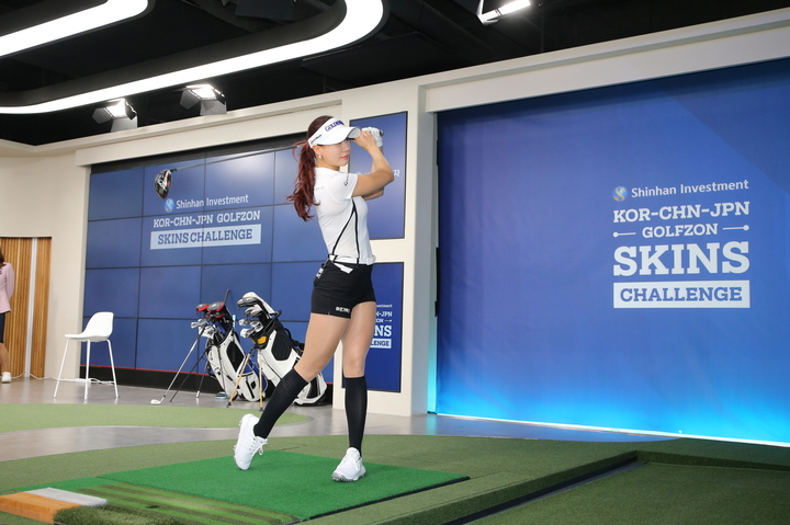 [서울=뉴시스] 조수정 기자 = 골프존이 26일, 한국 골프존타워서울 미디어 스튜디오와 스튜디오와 중국 골프존 상하이 플래그십 스토어, 일본 도쿄 골프존 스튜디오에서 실시간 네트워크 스크린골프 대회인 ‘신한금융투자 한-중-일 골프존 스킨스 챌린지’를 개최했다. 한국 대표 선수로는 김하늘(33), 유현주(27)가 출전했으며, 중국과 일본을 대표해 수이샹(23)과 리우원보(21), 유리 요시다(21)와 히카리 후지타(27)가 각각 팀을 이뤄 경기를 펼쳤다. 경기에 출전한 유현주 선수가 파워풀한 드라이버 샷을 하고 있다. (사진=골프존 제공)2022.02.26. [email protected] *재판매 및 DB 금지