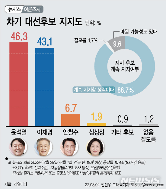 [그래픽] 윤석열 46.3% vs 이재명 43.1%…오차 내 접전