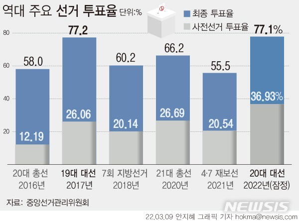 [서울=뉴시스] 제20대 대통령 선거 투표일인 9일 최종 투표율이 77.1%로 잠정 집계됐다. 직전 19대 대선보다 0.1%포인트 낮은 수치다. (그래픽=안지혜 기자)