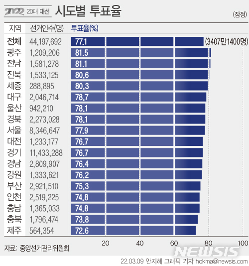 [서울=뉴시스] 제20대 대통령 선거 투표일인 9일 최종 투표율은 77.1%로 잠정 집계됐다. 직전 대선보다 0.1%포인트 낮은 수치다.