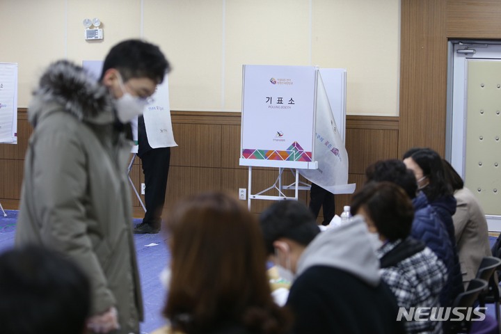 [춘천=뉴시스] 김경목 기자 = 제20대 대통령선거 투표일인 9일 오전 시민들이 강원 춘천시 춘천남부노인복지관 1층 강남동 제2투표소에서 소중한 참정권을 행사하고 있다. 2022.03.09. [email protected]