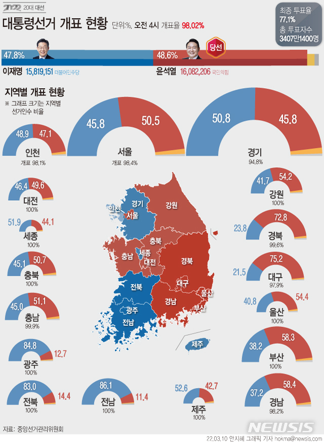 [서울=뉴시스] 윤석열 국민의힘 대선 후보가 9일 실시한 대선에서 48.59%를 득표해 제 20대 대통령에 당선됐다. 윤 당선인은 98.02% 개표가 진행된 10일 오전 4시 현재 유효 투표의 48.59%인 1608만5787표를 얻어 47.79%(1581만9954표)를 얻은 더불어민주당 이재명 후보를 0.8%포인트 차로 앞섰다. (그래픽=안지혜 기자)
