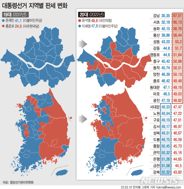 [서울=뉴시스] 중앙선거관리위원회는 10일 윤석열 국민의힘 후보를 대통령 당선인으로 공식 확정했다. 윤 당선인은 전날 치러진 제20대 대통령선거에서 득표율 48.56%(1639만4815표)로 대통령에 당선됐다. 47.83%(1614만7738표)로 2위를 기록한 이재명 더불어민주당 후보와는 0.73%p 차이로 초접전을 벌였다. (그래픽=안지혜 기자)
