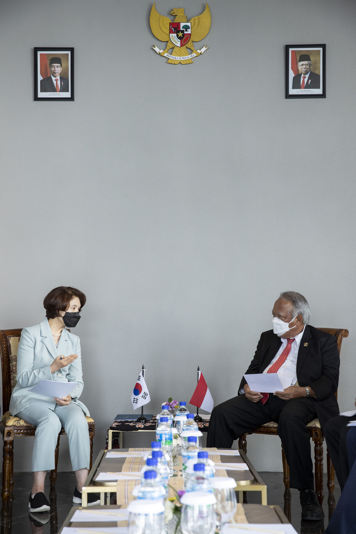 [서울=뉴시스] 조성우 기자 = 한정애 환경부 장관이 15일 오후(현지시간) 인도네시아 라부안바조에서 인도네시아 공공사업주택부 바수키 장관과 만나 인니 신수도 이전 관련 양국의 협력을 논의하고 2030 부산세계박람회 유치 지지 요청을 하고 있다. (사진=환경부 제공) 2022.03.15. [email protected] *재판매 및 DB 금지