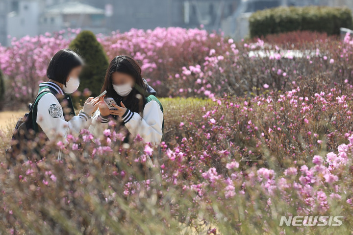 [서울=뉴시스] 권창회 기자 = 서울 낮 기온이 16도까지 오르는 등 따뜻한 봄 날씨를 보인 29일 오후 서울 서대문구 이화여자대학교에 진달래가 피어있다. 2022.03.29. [email protected]