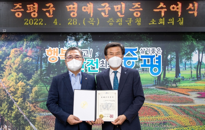 [증평=뉴시스] 강신욱 기자 = 충북 증평군 명예군민에 선정된 원광희(왼쪽) 충북연구원 지역발전연구센터장이 28일 오후 증평군청 소회의실에서 열린 수여식에서 홍성열 증평군수로부터 명예군민증을 받고 있다. (사진=증평군 제공) [email protected]