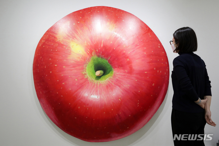 [서울=뉴시스] 박진희 기자 = '사과작가' 윤병락의 개인전 '윤병락 : 아카이브' 전시가 열린 3일 서울 강남구 호리아트스페이스에 작품 'Autumn's Fragance-Cosmos'(2019)가 사과 모양의 '변형 캔버스'에 그려져 전시되어 있다. 국내외 아트페어와 기획전, 유명 아트옥션과 갤러리에 러브콜이 끊이지 않는 작가이며, '솔드아웃 작가'라는 별명을 가지고 있다. 전시는 오는 6월 18일까지. 2022.05.03. [email protected]