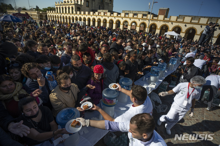 [루한=AP/뉴시스] 3일(현지시간) 아르헨티나 루한에서 '밀라네사의 날'을 맞아 주민들이 무료 밀라네사를 먹기 위해 몰려들고 있다. 밀라네사는 얇은 고기에 빵가루를 입혀 기름에 튀긴 아르헨티나 인기 음식으로 매년 5월 3일을 밀라네사의 날로 기념한다. 2022.05.04.