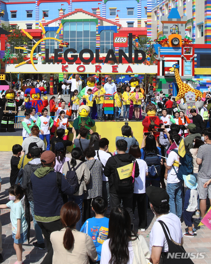 [춘천=뉴시스] 김경목 기자 = 제100주년 어린이날인 5일 오전 수많은 가족단위 인파들이 강원 춘천시 레고랜드 코리아 리조트 놀이시설에 입장하고 있다. 이날 공식 개장한 춘천 레고랜드 놀이시설은 세계에서 10번째 아시아에서 3번째로 모습을 드러냈다. 2022.05.05. [email protected]