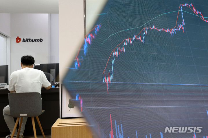 [서울=뉴시스] 백동현 기자 = 10일 오후 서울 서초구 빗썸 고객지원센터 전광판에 비트코인 시세가 표시되고 있다. 전날 CNBC에 따르면 비트코인은 12% 이상 하락해 3만달러 아래로 떨어졌다. 비트코인이 3만달러 아래로 떨어진 것은 지난해 7월 이후 처음이다. 2022.05.10. [email protected]