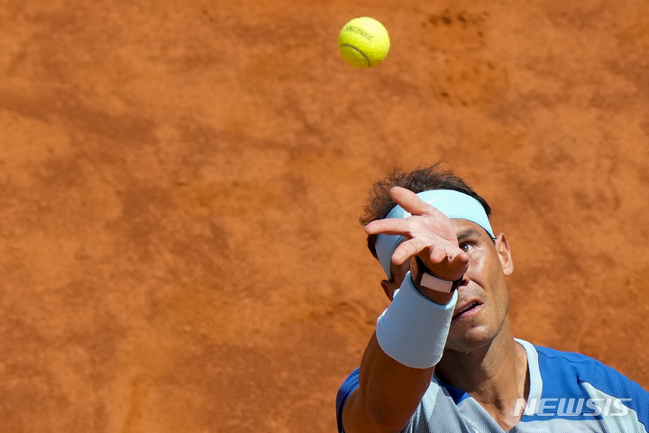 [로마=AP/뉴시스] 라파엘 나달(4위·스페인)이 11일(현지시간) 이탈리아 로마에서 열린 남자프로테니스(ATP) 투어 이탈리아 오픈 단식 2회전 존 이스너(27위·미국)와 경기하고 있다. 나달이  2-0(6-3 6-1)으로 이기고 16강에 진출했다. 2022.05.12.