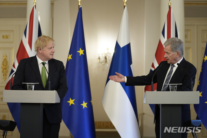 [헬싱키=AP/뉴시스] 보리스 존슨(왼쪽) 영국 총리와 사울리 니니스퇴 핀란드 대통령이 11일(현지시간) 핀란드 헬싱키 대통령궁에서 공동 기자회견을 하고 있다. 스웨덴과 핀란드가 러시아의 우크라이나 침공 이후 북대서양조약기구(나토) 가입을 검토 중인 가운데 존슨 총리는 두 나라와 상호 안전보장 협정을 체결했다. 2022.05.12.