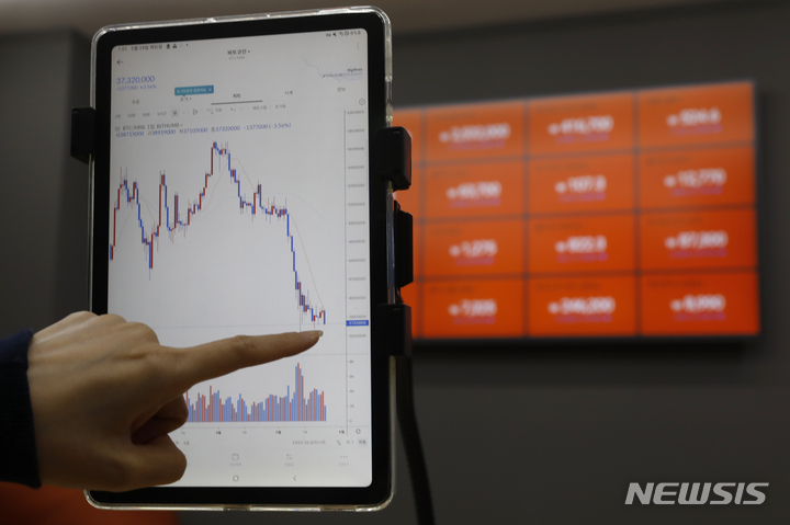 [서울=뉴시스] 고승민 기자 = 한국산 코인 '루나'와 자매코인 '테라USD(UST)'의 동반 폭락 사태를 계기로 국회가 당정 간담회를 열고 디지털자산기본법 제정방향을 논의한다. 사진은 24일 서울 서초구 빗썸 고객지원센터에서 관계자가 시세를 확인하는 모습. 국민의힘 정책위원회와 가상자산특별위원회는 이날 관계부처와 긴급 당정 간담회를 열고 대책을 점검한다. 간담회에는 빗썸, 업비트 등 국내 암호화폐거래소 대표 8인도 소집됐다. 2022.05.24. [email protected]