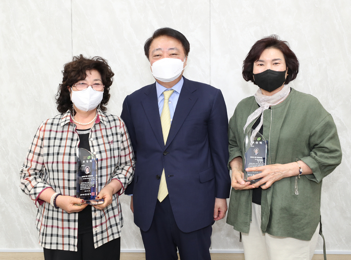 [청주=뉴시스] 임선우 기자 = 한범덕 충북 청주시장이 27일 시장 집무실에서 이달의 자원봉사왕에 선정된 봉명1동 김숙자 자원봉사대장(오른쪽)과 내덕1동 이남희 자원봉사대원(왼쪽)에게 표창을 수여하고 있다. 2022.05.27. [email protected]
