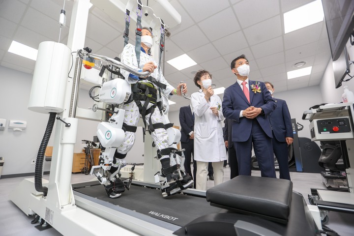 [서울=뉴시스] 박민식 국가보훈처장이 27일 부산보훈병원 재활센터 준공식에 참석해 주요 내빈과 함께 하지보행보조로봇 시연 및 시설을 순시하고 있다. (사진=국가보훈처 제공) 2022.05.27. [email protected]