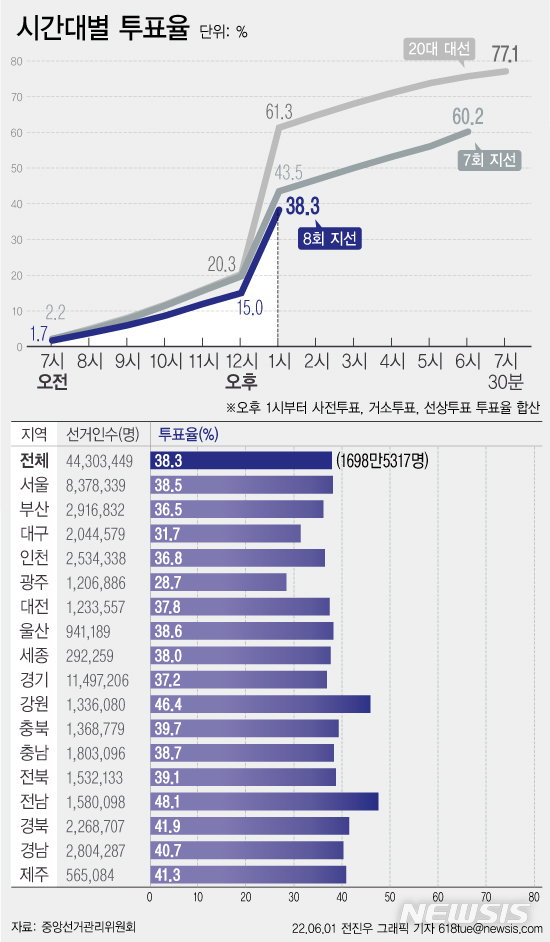 [서울=뉴시스] 제8회 전국동시지방선거 당일인 1일 오후 1시 현재 전국 평균 38.3%의 투표율을 기록하고 있다. 지역별로는 전남이 48.1%로 가장 높았고, 광주가 28.7%로 가장 낮았다. (그래픽=전진우 기자)