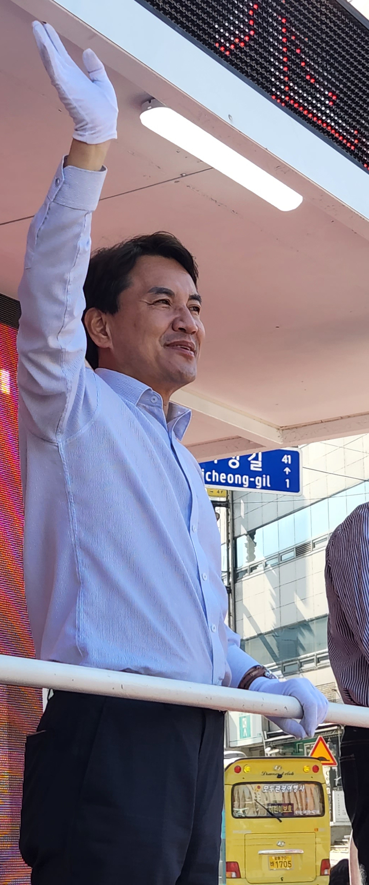 [춘천=뉴시스] 김경목 기자 = 김진태 국민의힘 강원도지사 당선인이 2일 오전 강원 춘천시 중앙로터리에서 출근길 시민들에게 당선 인사를 하고 있다. (사진=김진태 당선인 제공) 2022.06.02. [email protected]