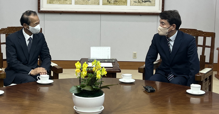 [춘천=뉴시스] 김경목 기자 = 김진태 국민의힘 강원도지사 당선인이 2일 오전 강원 춘천시 강원도청에서 최문순 지사와 환담을 나누고 있다. (사진=김진태 당선인 제공) 2022.06.02. [email protected]
