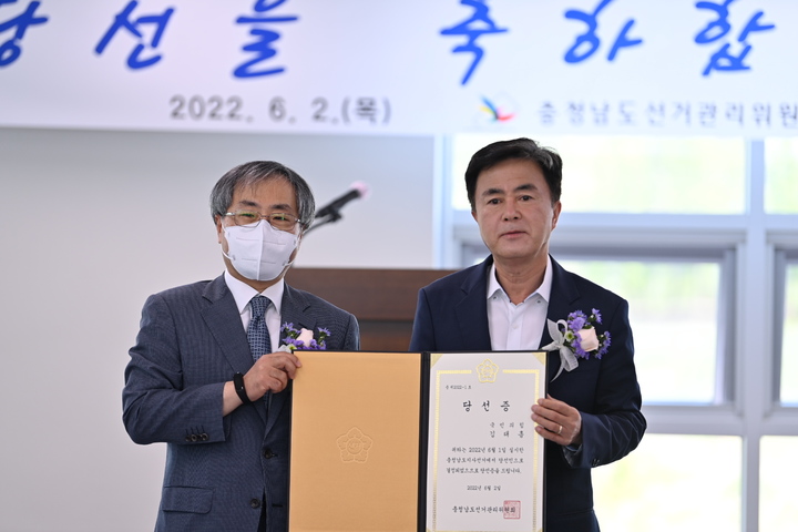 [홍성=뉴시스] 유효상 기자 = 김태흠 충남도지사 당선자가 2일 충남선거관리위원회 회의실에서 당선증을 교부받고 있다. (사진=김태흠 선거사무소 제공) 2022.06.02 [email protected]