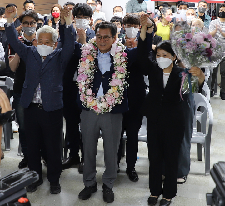 [강릉=뉴시스] 김경목 기자 = 김홍규 강원 강릉시장 당선인이 2일 오전 강원 강릉시 선거사무소에서 지지자들과 함께 당선의 기쁨을 만끽하고 있다. (사진=김홍규 당선인 제공) 2022.06.02. [email protected]