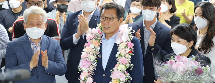 [강릉=뉴시스] 김경목 기자 = 김홍규 강원 강릉시장 당선인이 2일 오전 강원 강릉시 선거사무소에서 당선 소감을 말하고 있다. (사진=김홍규 당선인 제공) 2022.06.02. [email protected]