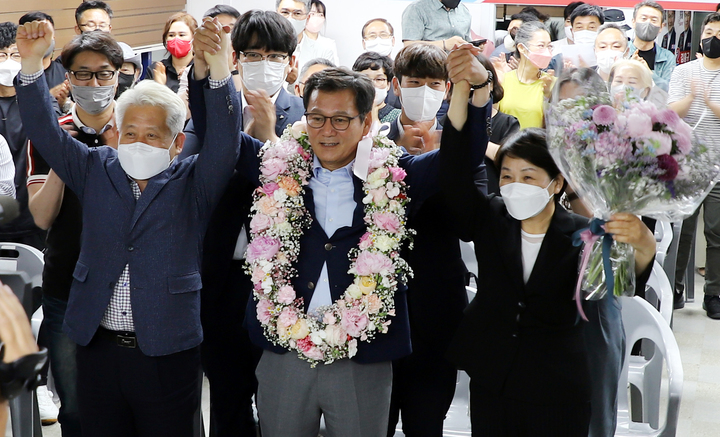 [강릉=뉴시스] 김경목 기자 = 김홍규 국민의힘 강원 강릉시장 당선인이 2일 오전 강원 강릉시 선거사무소에서 지지자들과 함께 당선의 기쁨을 만끽하고 있다. (사진=김홍규 당선인 제공) 2022.06.02. [email protected]