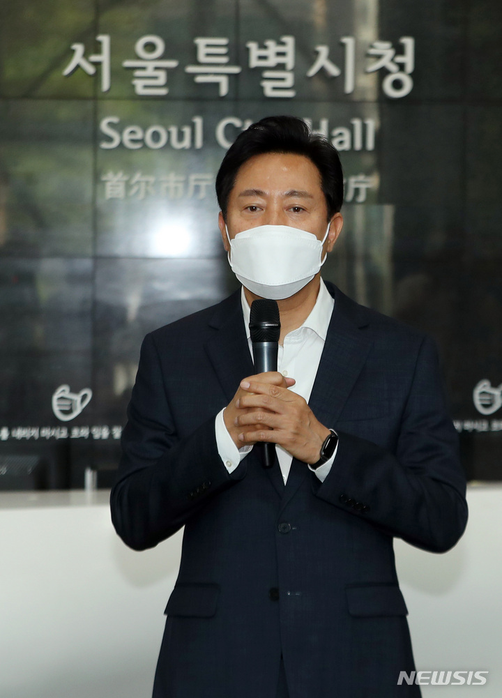[서울=뉴시스] 김진아 기자 = '4선 서울시장'에 오른 오세훈 시장이 2일 오전 서울시청으로 출근하며 당선 소감을 전하고 있다. (공동취재사진) 2022.06.02. [email protected]