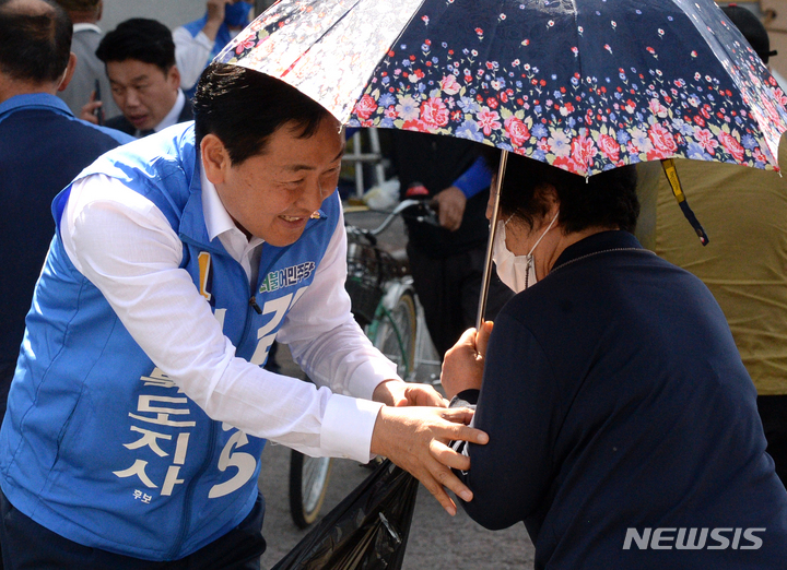 [전주=뉴시스] 김얼 기자 = 김관영 더불어민주당 전북도지사 당선인이 2일 전북 전주시 모래내시장을 방문해 시민들에게 감사인사를 전하고 있다. 2022.06.02. [email protected]
