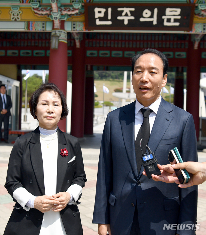 [광주=뉴시스] 류형근 기자 = 제8회 전국동시지방선거 광주시장에 도전했던 국민의힘 주기환 후보와 김용님 광주 광역의회 비례대표 당선자가 2일 오전 광주 북구 운정동 국립5·18민주묘지를 참배한 뒤 향후 계획에 대해 설명하고 있다. 2022.06.02. [email protected]