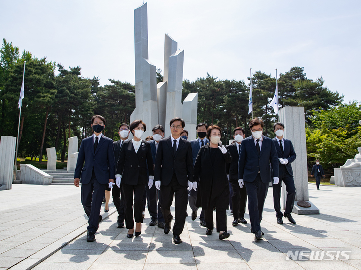 [수원=뉴시스] 김종택기자 = 김동연 더불어민주당 경기도지사 당선인이 2일 오전 경기도 수원시 팔달구 인계동 현충탑 참배를 마친 뒤 나서고 있다. 2022.06.02. [email protected]