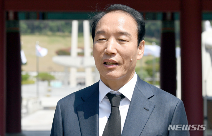 [광주=뉴시스] 류형근 기자 = 제8회 전국동시지방선거 광주지역에 출마했던 국민의힘 주기환 광주시장 후보가 2일 오전 광주 북구 운정동 국립5·18민주묘지를 참배한 뒤 거취에 대해 이야기 하고 있다.  2022.06.02. [email protected]