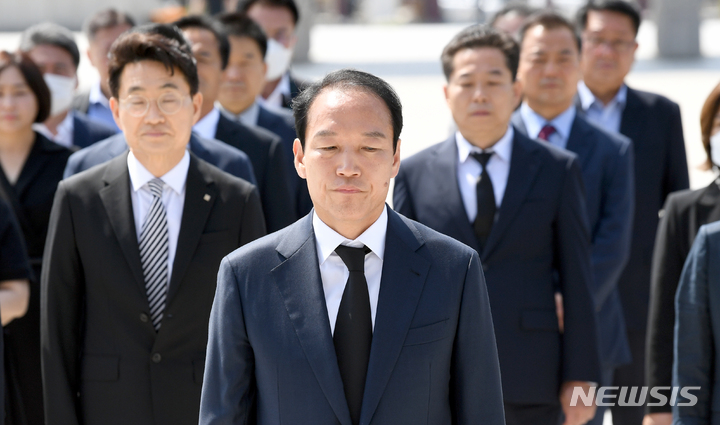 [광주=뉴시스] 류형근 기자 = 제8회 전국동시지방선거 광주지역에 출마했던 국민의힘 주기환 광주시장 후보가 2일 오전 광주 북구 운정동 국립5·18민주묘지를 참배하고 있다. 2022.06.02. [email protected]
