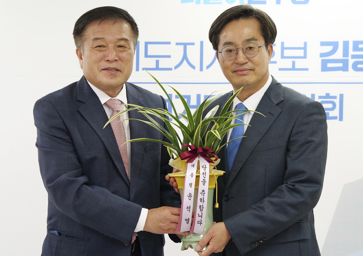 [수원=뉴시스] 최진석 기자 = 김동연(오른쪽) 경기도지사 당선인이 2일 경기 수원 팔달구 선거캠프 사무실에서 이진복 대통령실 정무수석이 갖고온 윤석열 대통령이 보낸 축하난을 전달받고 있다. (사진=김동연 캠프 제공) 2022.06.02. [email protected] *재판매 및 DB 금지